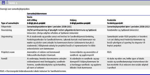 Der anvendes forskellige modeller for det igangsatte samarbejde mellem forskning og praksis: et ph.d.-projekt i Varde Kommune, en postdoc i Esbjerg Kommune og et eksternt finansieret projekt i Fredericia. Projekterne tager alle udgangspunkt i et konkret arbejde med folkesundheden i kommunerne, eksempelvis implementering af sundhedspolitikker, udarbejdelse af sundhedsprofiler og igangsættelse af interventioner. Samarbejdet skal resultere i videnskabelige artikler, men også i mere lettilgængelige og anvendelige dokumenter, der kan benyttes i kommunal kontekst. Eksempler herpå er en skabelon for evaluering af Varde Kommunes sundhedspolitik, introduktion til flerstrengende interventioner i Esbjerg Kommune og forskellige rapporter om den sociale og sundhedsmæssige profil for Korskærparken i Fredericia (Tabel 1 ).