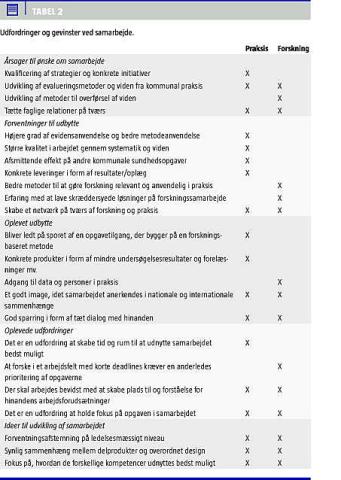 Samarbejdet mellem forskning og praksis er et forsøg på at styrke evidensanvendelse i kommunal praksis på folkesundhedsområdet på trods af de ovennævnte udfordringer. I denne artikel præsenteres de erfaringer, der er gjort i samarbejdets første år.