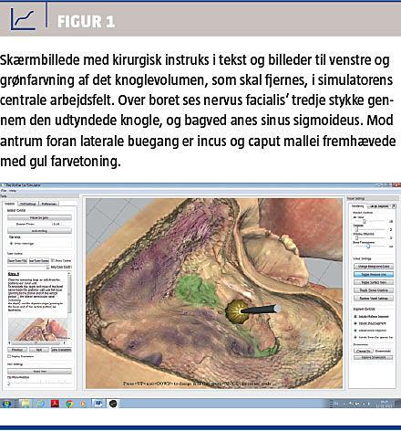 De seneste ti år er der udviklet en række pc-baserede virtuelle simulatorer til interaktiv kirurgisk træning. Med simulatorerne kan man tilbyde et risikofrit miljø, hvor den uddannelsessøgende kan opnå basale kompetencer. Hidtil har tindingebenssimulatorerne været baseret på CT-billeder, og den tredimensionelle repræsentation af tindingebenet er derfor kunstigt farvelagt og opløsningen beskeden [1-3]. Desuden er prisen høj (ca. 250.000 kr.) [1] eller tilgængeligheden begrænset og eventuelt betinget af projektdeltagelse hos udbyderen [2, 3]. Vi har udviklet en pc-baseret interaktiv ørekirurgisk simulator, Visible Ear Simulator (VES), som kan downloades gratis http://ves.cg.alexandra.dk [4, 5]. Den seneste VES version 1.2 udkommer på flere sprog og indeholder en ny type tutorfuntion til integreret egeninstruktion, som kan lette vejen fra lærebogens akademiske tekst og illustration til operatørens fornemmelse for kirurgisk navigation.