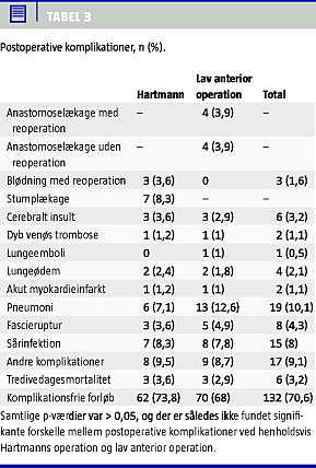 Det postoperative forløb var komplikationsfrit for i alt 70% af patienterne, og der var ikke signifikant forskel i antallet af komplikationer mellem de to grupper (73,8% (n = 62) af patienter, der var opereret med HO, og de patienter, der var opereret med LA (68% (n = 70), (p = 0,385)). Anastomoselækage efter LA forekom hos otte patienter, hvoraf fire måtte reopereres, mens fire patienter blev behandlet konservativt. Af de otte anastomoselækager var anastomosen hos tre patienter 5-10 cm fra anus (7,9%) og hos fem patienter 11-15 cm fra anus (8,3%). Stumplækage efter HO blev observeret hos syv patienter (8,3%) og blev behandlet med skylning af absceskaviteten. Tredivedagesmortaliteten var for den samlede patientgruppe 3,2% (n = 6) og var ikke signifikant forskellig mellem de to grupper (HO 3,6% (n = 3,) og LA 2,9% (n = 3,) (p = 1) (Tabel 2 og Tabel 3 )). En patient, der var opereret med LA, suiciderede efter et i øvrigt ukompliceret operationsforløb. Af de i alt 26 patienter med en ASA- score på III døde en, hvilket svarer til 3,8%. Patienten døde i relation til et forløb med anastomoselækage. Ingen af de 18 med ASA III i HO-gruppen døde.