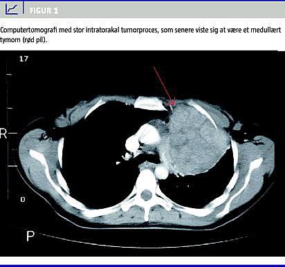 En 43-årig, tidligere rask kvinde blev grundet gentagne tilfælde af diaré udredt med koloskopi med biopsier, der viste uspecifik colitis uden holdepunkter for kronisk inflammatorisk tarmsygdom. Mesalazin havde nogen effekt på tilstanden. Pga. luftvejsinfek-tioner fik patienten seks måneder senere taget røntgen af thorax, hvor man uventet fandt breddeøget mediastinum. En computertomografi (CT) bekræftede en mediastinal tumor (Figur 1 ), som blev fjernet radikalt kirurgisk. Tumoren var et benignt medullært tymom.