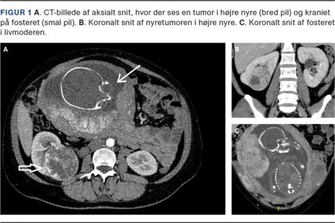 En 43-årig kvinde, som var diagnosticeret med hypertension og tidligere ryger, fik som tredjegangsgravid flere episoder med uspecifikke smerter og gener fra lænd og abdomen. Der blev påvist proteinuri, hvorfor hun i gestationsuge 25 + 0 blev UL-skannet pga. mistanke om nefrotisk syndrom. Skanningen viste en malignitetssuspekt tumormasse på højre nyre, og ved biopsi påvistes nyrecancer af typen clear cell RCC (ccRCC). Patienten blev henvist til en urologisk afdeling, hvor der efter konference mellem radiologisk, urologisk og obstetrisk afdeling blev udført CT af thorax og abdomen Patienten var på daværende tidspunkt i gestationsuge 29 + 6. CT viste ingen tegn til disseminering, men en 7 cm centralt beliggende tumor i højre nyre (Figur 1). Renografi vistenormal funktionsfordeling. Patienten blev tilbudt sectio og åben partiel nefrektomi som joint-venture mellem obstetrisk afdeling og urologisk afdeling, da hun var i gestationsuge 32 + 0. Indgrebet blev foretaget ved midtlinjeincision i epiduralanæstesi, indtil barnet var blevet forløst, hvorefter patienten blev lagt i generel anæstesi. Barnet var velskabt og kunne udskrives efter en kortere indlæggelse på neonatalafdelingen.
