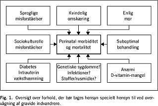 Dette spørgsmål kan ikke besvares, uden at man må tage hensyn til en række samvarierende faktorer. To skandinaviske afhandlinger har belyst problemstillingen og er kommet frem til, at specielt indvandrerkvinder fra lavindkomstlande som Somalia og Pakistan befinder sig i en risikogruppe for perinatal mortalitet, sammenlignet med andre kvinder født i udlandet eller skandinavisk fødte kvinder [1, 2]. Ved bedømmelse af den enkelte indvandrerkvindes risiko bør man tage hensyn til individuelle risikofaktorer. Fig. 1 illustrerer en oversigt over tilstande, som klinikere rekommanderes at overveje i arbejdet med gravide indvandrere. Disse rekommandationer diskuteres i det følgende.