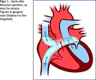 Transpositio vasorum er den ottendehyppigste medfødte hjertesygdom og optræder med en incidens på fem pr. 10.000 fødsler [1]. Tilstanden er karakteriseret ved, at aorta afgår fra højre ventrikel og arteria pulmonalis fra venstre ventrikel. I dag korrigeres transposition med den arterielle switch-operation, hvor aorta og arteria pulmonalis deles over klapniveau og anastomoseres til de korrekte ventrikler, mens koronararterierne samtidigt translokeres til den »nye« aorta. Indtil omkring 1990 blev danske børn med transposition primært opereret ad modum Mustard. Ved denne operation erstattes det normale atrieseptum med en intraatrial perikardie-patch , som tunnelerer blodet fra venae cavae til venstre atrium, mens blodet fra lungevenerne tilsvarende dirigeres til højre atrium. Operationen sikrer et normalt kredsløb, men fastholder den abnorme forbindelse mellem ventriklerne og de fraførende arterier (Figur 1), hvilket er forbundet med en række langtidsproblemer, f.eks. obstruktion af de redirigerede venøse tilløb, supraventrikulære arytmier og ikke mindst svigt af højre ventrikel, som postoperativt uændret fungerer som systemventrikel [2, 3].