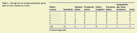 En kvinde havde under sin tredje graviditet hjertebanken, åndenød, svimmelhed og træthed. Alle undersøgelsesresultater var uændrede og hverken indlæggelse eller behandling fandtes indiceret. Hendes andet og tredje barn blev efter eget ønske og på indikationen »maternel hjertefejl« forløst ved elektivt sectio. De to øvrige kvinder gennemførte graviditeterne uden kardielle symptomer eller forværring.