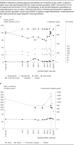 To uger efter fødslen var den nybagte mor i velbefindende. Hun malkede mælk ud til drengen, havde selv tabt sig 10 kg og fik ikke BT-nedsættende medicin. Figur 1A viser udviklingen gennem graviditeten af kreatinin, eGFR og urinalbumin-kreatinin-ratioen. Figur 1B viser HbA1c samt ikkefastende værdier af insulin og proinsulin C-peptid.