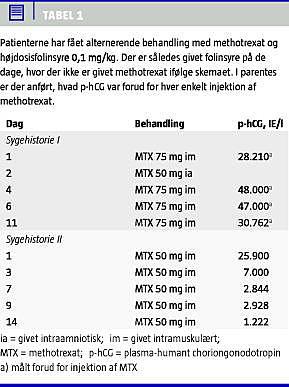 II. En 35-årig gravida 2 para 1, der fremstod klinisk stabil, henvendte sig med kraftig vaginalblødning ved gestationsalder 6+0. Hendes første graviditet opnået ved IVF på grund af oligomenore. Forløbet var ukompliceret, og graviditeten var blevet opnået med to optøede embryoner. Ved indlæggelsen viste en transvaginal ultralydskanning en tom uterinkavitet. Gestationssækken (3,9 7,5 mm) var placeret cervikalt uden synligt fosterekko, der var ingen sliding-tegn, og p-hCG var på 25.900 IE/l. Diagnosen var en ikke-levende cervikal graviditet. Patienten blev indlagt til observation og behandling. Hun blødte fortsat kraftigt, fik lavt blodtryk (85/50 mmHg), og hæmoglobinniveauet var 3,1 mM. Efter informeret samtykke til konservativ behandling fik patienten tranexamsyre givet intravenøst (1 g × 3) og blev optransfunderet med fire portioner saltvand, adenin, glukose og mannitol. Hun stabiliseredes, og den vaginale blødning lå inden for det tilladelige omfang. Herefter blev der påbegyndt injektion af methotrexat 1 mg/kg (50 mg) givet intramuskulært (Tabel 1). Der blev givet i alt fem injektioner alternerende med folinsyre 0,1 mg/kg. Efter ni dage blev patienten udskrevet til ambulant kontrol. Toogfyrre dage efter diagnosen var p-hCG ikke målbar, og en ultralydskanning viste en tom cervikalkanal uden graviditet. Hun fortsatte med at indtage højdosisfolinsyre (5 mg dagligt), og IVF-behandling blev planlagt til tre måneder efter sidste methotrexatinjektion.