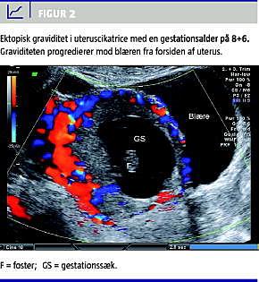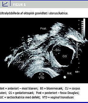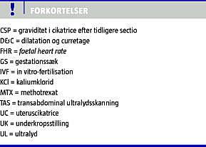 Frekvensen af sectio er stigende i verden [1]. I Danmark udgør andelen af fødsler, som sker ved sectio, 22,3%. Hvert femte sectio udføres uden medicinsk indikation og på moderens ønske [2]. Der er gennem de senere år kommet mere fokus på de komplikationer, der ses i efterfølgende graviditeter. De mere alvorlige kan være uterusruptur, placenta accreta/percreta, postpartum hysterektomi og ektopisk graviditet i uteruscikatricen (CSP) [1, 3]. Sidstnævnte kan medføre svær maternel morbiditet og i værste fald mortalitet [3]. CSP blev først beskrevet i 1978, og frem til 2001 var der publiceret 19 cases [4]. Siden da har der været en øget rapportering af cases i litteraturen. I samme periode er frekvensen af sectio steget, ultralyds (UL)-apparatur og diagnostik er forbedret, og den kirurgiske teknik til suturering af uterus ved sectio har ændret sig. Nu lukker man uterus i et lag mod tidligere to. Alle tre forhold kan spille en rolle for den øgede forekomst af CSP [6].