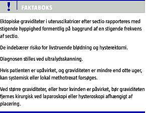 Ektopisk graviditet i uteruscikatricen efter et sectio er stadig sjældent, men forekommer med øget hyppighed, hvilket formentlig skyldes den stigende sectiofrekvens. Disse ektopiske graviditeter medfører risiko for alvorlig blødning, uterusruptur, hypovolæmisk shock og hysterektomi - og dermed øget morbiditet og mortalitet for kvinden. Halvdelen debuterer med symptomer i form af vaginal blødning og/eller milde til moderate nedre mavesmerter. Diagnostik foretages fortrinsvis ved ultralydsskanning (UL). Behandling, opfølgning samt fremtidig fertilitet afhænger af graviditetens størrelse, lokalisationen og gestationsalderen.
