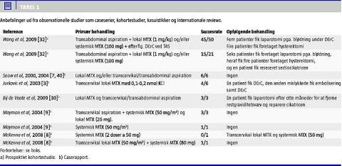 I det samme prospektive kohortestudie konkluderede man, at behandling med MTX efterfulgt af skanningsovervåget dilatation og curettage medførte en afkortning af sygdomsforløbet i forhold til MTX-behandling alene. Dog falder frekvensen af komplikationer ikke, herunder heller ikke hysterektomiraten, der var ens i begge grupper [32] (Tabel 1). Blind uterin curettage som primær behandling frarådes pga. vanskelig adgang til graviditetsvævet og dermed øget risiko for perforation og blødning [30]. Tidligere studier har påvist svær blødning hos 76% og en hysterektomirate på 14% hos denne gruppe [6].