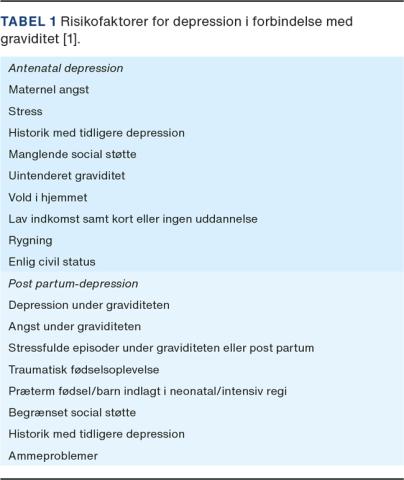 Risikofaktorer i graviditetsdepression er genetiske forhold, hormonelle ændringer samt psykologiske og sociale faktorer (Tabel 1).