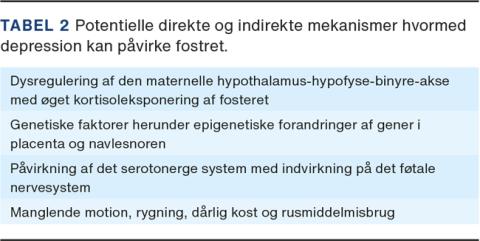 Derudover kan der ved depression være dårlig komplians mht. svangreomsorg og øget forekomst af rygning, alkohol- og stofmisbrug, usund ernæring og manglende motion [16] (Tabel 2).