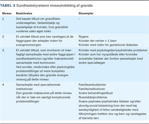Den gravides første kontakt med sundhedssystemet sker hos den praktiserende læge. Ud fra psykiatrisk anamnese visiteres den gravide efter Sundhedsstyrelsens anbefalinger om niveauinddeling (Tabel 3). Mange fødesteder følger disse sårbare gravide i særlige team. Hvordan tilbuddet konkret er opbygget, kan variere fra sted til sted, men det kan omfatte hyppigere jordemoder- og lægekonsultationer end der sædvanligvis tilbydes.