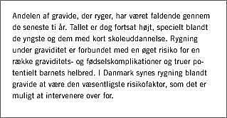 Rygning under graviditet øger risikoen for en række graviditets- og fødselskomplikationer, ligesom intrauterin eksponering for tobaksrøg er forbundet med en øget sygelighed og risiko for død i barnets første leveår [1, 2]. Tobaksrøg indeholder flere tusinde forskellige og potentielt skadelige kemiske stoffer. Man ved, at den fysiske afhængighed af tobak skyldes nikotinindholdet i tobakken, og at manglende tilførsel af nikotin til en ryger kan give abstinenssymptomer. Hvilken rolle nikotin spiller for tobaksrøgens skadevirkninger på graviditet og foster er utilstrækkeligt belyst [3], men resultaterne af dyreeksperimentelle undersøgelser har antydet, at nikotin kan spille en rolle for sammenhængen mellem intrauterin eksponering for tobaksrøg og risikoen for pludselig uventet spædbarnsdød og måske også for udvikling af adfærdsforstyrrelser hos barnet. Andre risici, der er forbundet med rygning, må nok snarere tilskrives molekylære og cellulære forandringer, der er forårsaget af et samspil af en række andre kemiske stoffer i tobaksrøg [3].