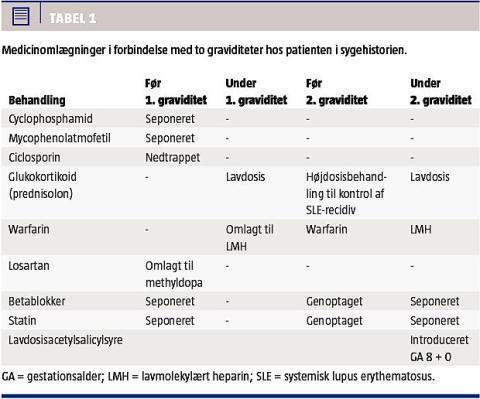 Immunmodulerende terapi omfattede tidligt i sygdomsforløbet cyclophosphamid og methotrexat, senere mycophenolatmofetil og tre måneder prækonceptionelt ciclosporin og lavdosis prednisolon (Tabel 1). Medicinomlægningen var efterfulgt af protein-urier på op mod 4 g/døgn. På konceptionstidspunk-tet var denne værdi nedbragt med højdosis prednisolonbehandling til 1 g/døgn. Ved bekræftet graviditet blev warfarin omlagt til lavmolekylært heparin i terapeutiske doser.
