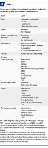 Her gives et overblik over kliniske præsentationer af sjældne, hyppige, benigne og alvorlige neurologiske symptomer, som man som obstetriker, praktiserende læge og neurolog bør kende for at kunne stille den rigtige diagnose hos gravide uden kendt neurologisk sygdom (Tabel 1).