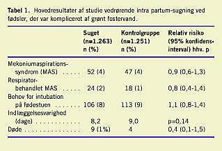 I et tidligt interventionsstudie fandt man kun et tilfælde af MAS blandt 273 børn, der blev suget intra partum mod 18 tilfælde (heraf fem døde) blandt 947, der kun blev suget post partum [1]. I andre studier med historiske kontroller er der ikke genfundet samme slående effekt. Trods den manglende evidens er intra partum-sugning alment accepteret og indgår i en international udbredt rekommandation for genoplivning ved fødslen [2], og såmænd også i den danske. Først nu er metoden testet i et regelret gennemført studie [3]. Studiet er et multicenterstudie med 11 centre i Argentina og et i USA. Halvdelen var offentlige sygehuse for en underprivilegeret patientgruppe, den anden halvdel var private sygehuse for et middel- og overklasseklientel. Studiet foregik i 2000-2001. Man inkluderede 2.514 børn født i hovedpræsentation efter 37 fulde uger, hvor der blev bemærket grønt fostervand tidsnok til, at randomisering kunne gennemføres. Med accept fra relevante etiske komiteer blev der ikke indhentet samtykke fra de fødende, hvis børn indgik i studiet. Denne beslutning er kontroversiel [4], men skal ikke diskuteres nærmere her. Børn randomiseret til sugning blev suget i oropharynx og om muligt i nasopharynx før skuldrenes fødsel, uanset om fødslen foregik vaginalt eller ved sectio. Efter fødslen blev der kun suget ved behov. Herefter blev begge grupper børn behandlet ens i overensstemmelse med den tidligere nævnte internationale konsensus: Påvirkede børn (dårlig respiration, nedsat muskeltonus, bradykardi) blev intuberet, trakealsuget og manuelt ventileret. Respirationsinsufficiens og anden sygelighed blev behandlet af klinikere, der var vidende om, at barnet indgik i undersøgelsen, men ikke kendte til resultatet af randomiseringen. Analysen var på intention-to-treat-basis. Grupperne var ens, hvad angår demografiske data og obstetriske risikofaktorer. Resultaterne for studiegruppen som helhed ses i Tabel 1 . Som det ses, er der ikke forskel på de to grupper. Subgruppeanalyse for børn født med tykt grønt fostervand (13% af populationen), ved sectio (32%), sectio uden veer (8%), påvirket fosterhjertefrekvens (11%) eller med behov for ventilation på fødestuen (9%) viste også stor lighed i de to grupper. Der var en langtfra signifikant større dødelighed i gruppen, der var randomiseret til sugning, men intet påfaldende i fordelingen af dødsårsager mellem grupperne.