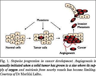 The underlying causes of cancer are lesions in critical genes regulating cell growth and differentiation and maintenance of the genome integrity. Mutations activating oncogenes or inactivating tumor suppressor genes can be found in most types of human cancer. Mutations in gene products controlling DNA damage repair result in predisposition to cancer because of increased genomic instability. Damaged normal cells may activate the programmed cell death pathway, presumably when cellular damage is beyond repair. In cancer cells these control points are lost, and the cells continue unrestricted proliferation. They also induce the cellular proteolytic machinery for invasion and growth factor gene expression for stimulation of tumor vascularization or angiogenesis (Fig. 1 ).