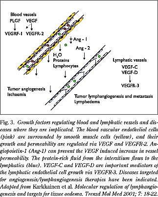 Many common cancers metastasize to the regional lymph nodes. Regional lymph node metastasis in general correlates with poor prognosis of the disease. This has lead to a hypothesis that tumor cell invasion occurs via the lymphatic vessels and raised a question of the role of lymphangiogenic factors in metastatic processes. Accordingly, VEGF-C is upregulated in many solid tumors and its expression seems to correlate with lymph node metastasis. On the other hand, the absence or dysf unction of the lymphatic vessels, which usually results from an infection, surgery, radiotherapy or from a genetic defect, causes lymphedema that is characterised by a chronic accumulation of protein-rich fluid in tissues. The importance of VEGFR-3 signalling for lymphangiogenesis is evident in the genetics of familial lymphedema, a disease characterised by a hypoplasia of lymphatic vessels mainly in the skin, which leads to a disfiguring and disabling swelling of the extremities. Some lymphedema families carry heterozygous missense mutations of the VEGFR3 exons encoding the tyrosine kinase domain, resulting in an inactive receptor protein. Interestingly, despite the genetic defect in VEGFR-3 signalling, new lymphatic vessels can be generated in a mouse model for hereditary lymphedema by using VEGF-C gene therapy.