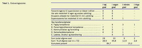 Såfremt metoden senere skal anvendes målrettet i lægers videreuddannelse, vil det være formålstjenligt at ændre eva-lueringsskemaet, så det specifikt relateres til de syv speciallægeroller. Man vil på den måde bedre kunne evaluere, om mere konkrete målsætninger for udbyttet af supervisionsforløbet kan blive honoreret. Endelig skal det nævnes, at fordelen ved at evalueringsskemaerne ikke var anonyme var, at det muliggjorde en høj svarprocent. Ulempen var overvejende risikoen for, at respondenterne ville give uforholdsmæssigt positiv feedback for ikke senere at afskære andre fra at få samme mulighed.