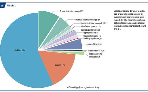 I et retrospektivt studie med 786 danske mænd med GM blev der fundet underliggende årsager i 43% af tilfældene (Figur 1) [2]. Hos ca. 12%, dvs. ca. 28% af dem, der havde fået påvist årsag, var der mere end én årsag til GM. I opgørelsen medtog man ikke patienter, hvor GM var opstået pga. misbrug af anabole steroider, eller prostatacancerpatienter, der var i antiandrogenbehandling, idet årsagen var oplagt, og endokrinologisk udredning reelt ikke var mulig. Jo ældre mændene var ved debut af GM, jo større var sandsynligheden for at diagnosticere en eller flere underliggende årsager. Stigende alder er således ikke et argument imod udredning, tværtimod.