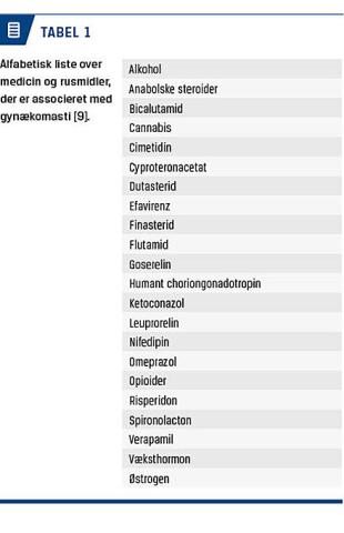 Den hyppigste endokrinologiske årsag var testosteronmangel (samlet ca. 16%) og den næsthyppigste var hypertyreose (ca. 2%). Hypertyreose fremkalder GM ved at ændre kønshormonprofilen til en øget østrogen-testosteron-ratio. Medicin og indtagelse af rusmidler er en hyppig årsag til GM. Virkningsmekanismen er dog i mange tilfælde fortsat ukendt, og hvis præparatet kan seponeres eller substitueres tidligt, er tilstanden ofte reversibel. De bedst dokumenterede stoffer fremgår af Tabel 1 [9]. Påvisning af en enkelt muligt udløsende årsag udelukker ikke en anden og også behandlingskrævende årsag. I de fleste af de tilfælde, hvor der