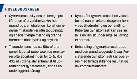Gynækomasti (GM) er en hyppig tilstand og skyldes benign proliferation af brystkirtelvævet hos mænd [1]. Tilstanden kan specielt i teenagealderen være socialt hæmmende, men er i den aldersgruppe ofte selvlimiterende og kan i de fleste tilfælde ses an, hvis man ved en objektiv undersøgelse (inkl. palpation af testes) i øvrigt ikke påviser noget abnormt [2]. Patienternes eventuelle frygt for brystkræft skal tages alvorlig, men brystkræft hos mænd er sjælden, og patienterne kan ofte beroliges ved første konsultation i primærsektoren. Ved klinisk mistanke om brystkræft viderehenvises der til primærudredning på en brystkirurgisk afdeling. Patienter med GM, der er opstået i voksenårene, skal som udgangspunkt henvises til endokrinologisk udredning. Undtagelserne er, hvis GM er opstået i forbindelse med hormonmanipulation, f.eks. som led i behandling af prostatacancer, eller ved misbrug af anabole steroider. Behandlingen skal så vidt muligt rettes mod den eller de underliggende årsager til GM. Persisterende og generende GM kan opereres plastikkirurgisk med gode resultater og lav komplikationsrate [3, 4].