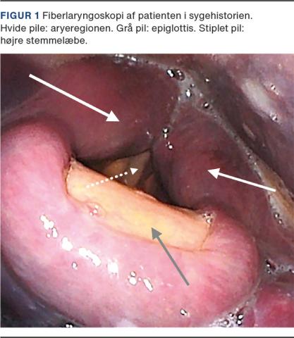 En 75-årig mand blev indlagt akut på Vejle Sygehus med halssmerter samt vejrtræknings- og synkebesvær efter fire dage med hoste, halssmerter og tiltagende blålige misfarvninger på halsen og brystet. Patienten var kendt med hjerteinsufficiens, psoriasis og atrieflimren og var i behandling med rivaroxaban (faktor Xa-hæmmer). Objektiv undersøgelse viste stridor og ekkymoser på hals og truncus. Cavum oris fremstod med submukøse blødninger sublingvalt og ved venstre tonsilleje. Fiberlaryngoskopi viste slimhindeødem og submukøst hæmatom i epiglottis og aryeregionen resulterende i begrænset indblik til plica vocales og trachea (Figur 1).