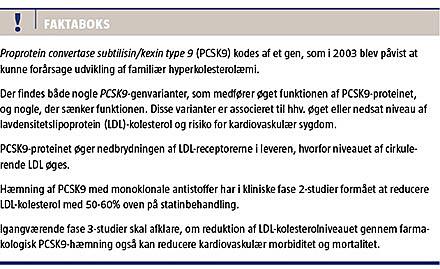 Højt lavdensitetslipoprotein-kolesterol (LDL-c)-niveau er en veletableret risikofaktor for udvikling af aterosklerotisk hjerte-kar-sygdom, og gennem de seneste to årtier har sænkning af LDL-c-niveauet med statiner været en af hjørnestenene i både den primære- og den sekundære forebyggelse. Det har med succes bidraget til at reducere forekomsten af kardiovaskulære hændelser [1-3], og statiner er nu en af de mest sælgende lægemiddelgrupper, hvor simvastatin i 2013 indtog førstepladsen som det mest solgte lægemiddel i Danmark [4]. Imidlertid sænker statinerne trods maksimal behandling ikke altid LDL-c-niveauet tilstrækkeligt i forhold til det ønskelige målniveau. Dertil kommer, at en del patienter ikke tåler behandlingen pga. bivirkninger, på trods af at bivirkningsfrekvensen ved brug af statiner i klinisk kontrollerede studier er lav [5]. De farmakologiske muligheder for sænkning af LDL-c-niveauet er ud over statiner begrænsede, og derfor er der et behov for nye lægemidler, der effektivt kan sænke niveauet og yderligere reducere den kardiovaskulære morbiditet og mortalitet.