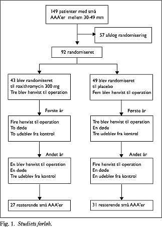 Materiale og metoder: Tooghalvfems patienter med små AAA'er blev rekrutteret fra to populationer. Den ene population var fra 6.339 mænd mellem 65 år og 73 år, der blev tilbudt screening for AAA på det lokale sygehus i Viborg Amt. Fra denne population blev 66 patienter rekrutteret. De resterende 26 patienter blev rekrutteret fra 49 patienter med små AAA'er, der var blevet diagnosticeret ved intervalscreening af initialt ektatiske aorta med diametre mellem 25 mm og 29 mm. Deltagerne blev randomiseret til 300 mg roxithromycin peroralt per dag i 28 dage eller lignende placebo. Middelobservationstiden var halvandet år.