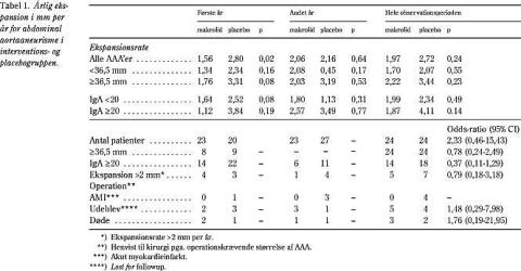 De første år blev middelekspansionsraten reduceret med 44% i interventionsgruppen (1,56 mm per år) og 2,80 mm per år i placebogruppen (p =0,02). Andet år var forskellen kun 5% (2,06 mm per år i interventionsgruppen og 2,16 mm per år i placebogruppen, p = 0,64) (Tabel 1 ). Der var en tendens til øget effekt af roxithromycin blandt patienterne med AAA over medianstørrelsen (36,5 mm) og ved initial IgA-titer over 1:20 (Tabel 1).
