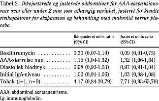 Resultater: Middelekspansionsraten var 44% lavere efter makrolidbehandling (1,56 mm per år) sammenlignet med 2,80 mm per år efter placebobehandling (p = 0,02). Multipel lineær regressionsanalyse viste, at behandling med roxithromycin og initial AAA-størrelse var signifikant relateret til AAA-ekspansion efter justering for rygning, diastolisk blodtryk og IgA-titer ≥ 20. Logistisk regressionsanalyse bekræftede en signifikant forskel mellem de to grupper ved ekspansionsrate på mere eller mindre end 2 mm per år som afhængig variabel (odds-ratio = 0,09 (95% CI: 0,01-0,83).