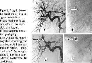 Patienten blev overflyttet til en specialafdeling med henblik på at få foretaget angiografi og videre vurdering. Dag 41 viste en selektiv hepatikografi en lille arteriobiliær fistel centralt i højre leverlap. Arterien emboliseredes med tre coils, hvorefter forløbet var ukompliceret (Figur 1 ).