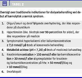 Omtrent to tredjedele af børnene får behov for dialyse, mens en tredjedel kun får lettere nyrepåvirkning og ikke har behov for dialyse [5]. Dialyseformerne er enten peritonealdialyse eller hæmodialyse, og i de fleste centre har peritonealdialyse været det foretrukne valg, især hos mindre børn. Se Tabel 2 vedrørende de traditionelle indikationer for dialyse ved HUS [25]. Enkelte forfattere betvivler dog, at azotæmi er en absolut indikation for dialyse, hvis patienten er nonoligurisk og nonencefalopatisk [25, 26]. De stiller strengere krav til påbegyndelse af dialysebehandling og finder, at mange af de patienter, der tidligere ville være blevet dialyseret, nu kan behandles konservativt uden øget forekomst af senkomplikationer eller dødsfald ved debut, men dog med en øget morbiditet i det akutte forløb.