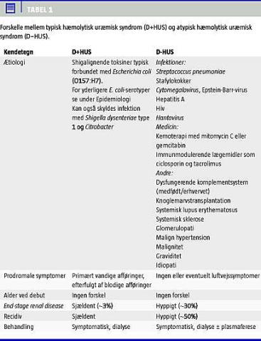 Mens D+HUS oftest forbindes med E. coli (O157:H7)( Tabel 1 ) er faktor H-mangel og Streptococcus pneumoniae hyppige årsager til D−HUS [6, 9]. Der ses medfødte genmutationer i komplementsystemet hos 30-50% af patienterne med D−HUS, af disse har 14-33% abnormiteter i faktor H-genet, 10-15% i membrankofaktorproteingenet og 2-13% i faktor I-genet. Faktor H-mangel skal man bl.a. overveje ved familiær og recidiverende HUS, men et barn med et andengangstilfælde af D+HUS skal ikke automatisk undersøges for komplementfaktorsygdom [10]. For yderligere årsager se Tabel 1.