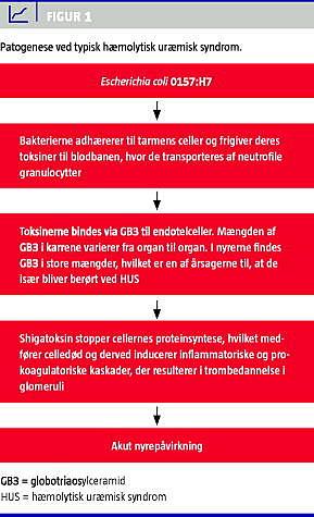 Ved HUS sker der skade på karrene i nyrernes glomeruli, hvilket fører til dannelse af trombocytaggregater med følgende både mekanisk hæmolyse og uræmi. D+HUS udløses af toksiner, der er produceret i tarmen. EHEC danner verotoksin, mens S. dysenteriae producerer Stx. Toksinerne er strukturelt og funktionelt homologe, og termerne shigatoksin og verotoksin anvendes derfor synonymt i litteraturen. Stx inddeles i to klasser: Stx-1 og Stx-2, hvoraf Stx-2 er 400 gange mere virulent end Stx-1. For yderligere beskrivelse af patogenesen ved D+HUS se Figur 1 . D−HUS skyldes ikke Stx, men en dysregulering af komplementsystemet [11]. S. pneumoniae -associerede HUS-tilfælde skyldes bakteriernes produktion af enzymet neuraminidase, der via Thomsen-Friedenreichs antigen aktiverer komplementsystemet og en trombotisk proces [12]. Lægemidler kan forårsage D−HUS på forskellige måder, f.eks. disponerer mitomycin C for HUS gennem en dosisafhængig endotelskade, mens andre lægemidler, f.eks. kinin, ved indgift inducerer dannelse af autoantistoffer mod bl.a. trombocytter [13].