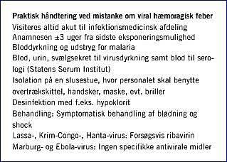 Efter Sundhedsstyrelsens retningslinjer skal mulige tilfælde indlægges på en regional infektionsmedicinsk afdeling. Patienten skal isoleres på en slusestue, og personalet skal anvende personlige værnemidler, inklusive maske, ansigtsvisir, overtrækskittel og handsker. Infektionsrisikoen har tidligere været overvurderet, men er størst hos familie og pårørende, der har passet patienten, og ved nosokomiel spredning i områder med begrænset mulighed for etablering af relevante isolationshygiejniske forholdsregler. De danske isolationsregler er fuldt dækkende. Formodede tilfælde anmeldes både telefonisk og skriftligt til embedslægen på patientens opholdssted samt til Epidemiologisk afdeling, SSI og Sundhedsstyrelsen. Embedslægeinstitutionen er ansvarlig for identifikation og information af kontakter. Kontakter defineres som personer, der har været i direkte kontakt med indekspatienten eller dennes sekreter eller ekskreter inden for tre uger fra sygdomsdebut.