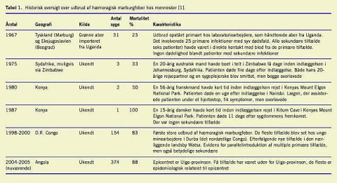 Filovirusudbrud er sjældne, men skaber opmærksomhed pga. sygdommens høje mortalitet, epidemiske potentiale og de manglende specifikke behandlingsmuligheder. Det første erkendte MHF-udbrud i Marburg, Tyskland, og i Jugoslavien i 1967 skete blandt laboratoriepersonale, der arbejdede med aber importeret fra Uganda. Efterfølgende har der kun været rapporteret om sporadiske tilfælde i lande som Sydafrika og Kenya samt et større udbrud i Congo i 1998 (Tabel 1) [3]. Sidstnævnte udbrud med 154 tilfælde i to fjerntliggende landsbyer over en toårig periode nåede aldrig samme intensitet som det nuværende udbrud [4]. Arbejde i lokale guldminer og modtagelse af injektioner blev identificeret som risikofaktorer ved udbruddet i 1998 [4].