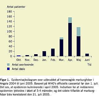 Pr. 5. juni 2005 rapporterede WHO om 423 tilfælde af MHF, heraf var 357 døde (Figur 1 ). I midten af juli har WHO revurderet tilfældene, sandsynligvis efter en nyere smallere casedefinition . Det officielle akkumulerede antal tilfælde er pr. 23. august 2005 374, heraf 329 døde (case fatality rate 88%). Den sidste halvanden måned inden tilkom der 24 nye tilfælde; dvs. at epidemien endnu ikke er fuldstændig overstået (Figur 1). Seks patienter var blevet diagnosticeret uden for Uige, og smitten synes indtil videre at være epidemiologisk relateret til epicentret. Der er ikke sket den frygtede spredning til hovedstaden, den befolkningstætte Luanda, med tre mio. indbyggere [6, 9].