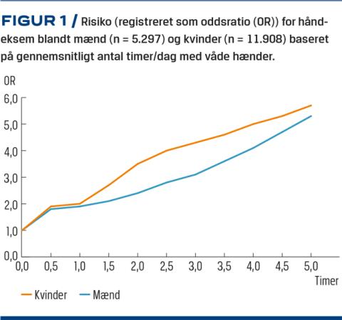 Vådt arbejde er den største risikofaktor for udvikling af håndeksem. Vådt arbejde erudbredt i mange forskellige erhverv, og studier viser, at ca. en femtedel af befolkningen har hænderne i kontakt med vand på deres arbejde [23-26]. Erhverv, hvor vådt arbejde udgør en del af arbejdsdagen, er kendetegnet som højrisikoerhverv med stor risiko for HE [5, 6, 27]. Data vedrørende eksponering for vådt arbejde er generelt selvrapporteret og indhentet gennem spørgeskemaer, som er validerede og sikret at være brugbare gennem observationelle studier. Med baggrund i sådanne undersøgelser er der for nylig udviklet en jobeksponeringsmatrix (JEM) for vådt arbejde. En JEM er et arbejdsmedicinsk værktøj, der dannes på baggrund af tilgængelige oplysninger om eksponering inden for forskellige erhverv. Oplysningerne samles herefter i en model, der kan bruges til statistiske sammenligninger. Den givne eksponering i forskellige befolkningsgrupper og erhverv fastlægges herved, og modellen kan bruges som værktøj ved rådgivning, regulering og forebyggende tiltag [15]. Denne strukturerede kortlægning af vådt arbejde har muliggjort en sammenligning af eksponeringer hos personer med og uden HE, hvilket har givet mulighed for at belyse dosis-respons-forholdet mellem vådt arbejde og HE på en ny måde [16]. Omfanget af vådt arbejde er undersøgt i flere studier, og det er påvist, at blandt rengøringspersonale har 50% vådt arbejde mere end to timer/dag [26], blandt sundhedspersonale vasker 30% hænder flere end 20 gange/dag [11], og blandt frisører har ca. 90% våde hænder mere end to timer/dag [24]. En sammenhæng mellem antal daglige håndvaske og HE er påvist af Ibler et al [7], og en sammenhæng mellem dagligt handskebrug, håndvask og HE er påvist af Hamnerius et al [11]. Blandt personer med anerkendt arbejdsbetinget HE i Danmark er et omvendt dosis-respons-forhold påvist mellem antal daglige timer på arbejde med våde hænder og mulighed for bedring og heling af HE [9]. Den samme tendens er fundet blandt kvindeligt rengøringspersonale, hvor 70% af den undersøgte population angav at opleve bedring af deres symptomer på hænderne i weekender og ferier [10]. Jo mere vådt arbejde, jo mere HE, og omvendt, men det er først for nylig, at et studie har vist, ved hvilket niveau af eksponering HE indtræder. Disse nye data indikerer, at en langt mindre eksponeringsgrad end tidligere antaget medfører risiko for udvikling af HE, og allerede ved ca. en halv times vådt arbejde dagligt stiger risikoen for HE til det dobbelte (Figur 1). Det er langt tidligere end de to timer/dag, som den hidtil anvendte definition af vådt arbejde lyder på [16]. Hermed foreligger der nu tilgængelige konkrete data for forebyggende interventioner og ikke mindst for en regulering på arbejdsmarkedet, hvilket ikke tidligere er set for eksponering for irritanter. Danmark har tradition for succesfuld regulering af eksponering for allergener, bl.a. nikkel, krom og epoxy [28-30]. Trods forebyggelseskampagner er det ikke lykkedes at få antallet af anerkendte tilfælde af HE forårsaget af vådt arbejde til at falde, og muligvis er en af årsagerne mangel på viden om dosis-respons-sammenhængen. De omtalte nye data viser, at allerede ved en halv times daglig eksponering er risikoen for HE fordoblet. Ved den nuværende definition af vådt arbejde på to timers daglig eksponering er risikoen tre en halv gange forhøjet. Den nye viden forbedrer muligheden for at rådgive med særligt fokus på den hyppigste årsag til arbejdsbetinget HE og forhåbentlig mindske antallet af HE.