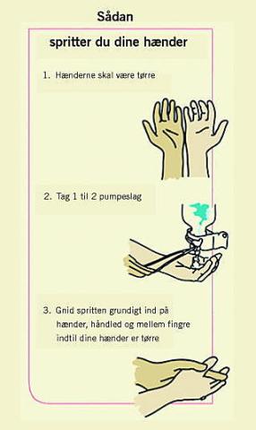 Kac et al [4] har i et randomiseret kontrolleret studie påvist, at mængden af håndsprit skal være 2-5 ml., dvs. nok til at hænder og håndled holdes våde med sprit i 20-30 sekunder. Håndspritten skal indgnides til tørhed, for at man opnår maksimal effekt af ethanol og glycerin.