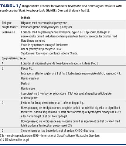 HaNDL er tidligere blevet kaldt migræne med cerebrospinal pleocytose eller pseudomigræne med lymfocytær pleocytose [1]. Syndromet er en sjælden tilstand og opstår som oftest hos personer uden kendt migræne [2]. Sygdommen forsvinder spontant i løbet af tre måneder [1], hvilket også fremgår af de diagnostiske kriterier for HaNDL vist i Tabel 1.