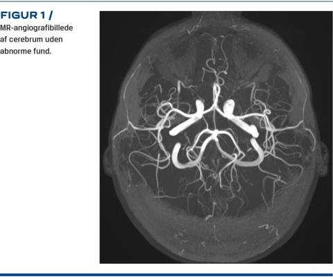 Han blev i de følgende dage tiltagende irritabel og vredladen, og der blev påbegyndt intravenøs behandling med methylprednisolon og immunglobulin, da autoimmun encefalitis ikke kunne udelukkes, samtidig med at HaNDL-syndrom blev overvejet som en mulig differentialdiagnose. Efter negative svar på de resterende undersøgelser og en supplerende MR-angiografi af cerebrum med normalt resultat (Figur 1) var alle kriterierne for HaNDL-syndrom opfyldt (Tabel 1). I de følgende dage oplevede patienten bedring uden yderligere anfald. Han blev udskrevet i velbefindende og havde efterfølgende ikke recidiv i over seks måneder.