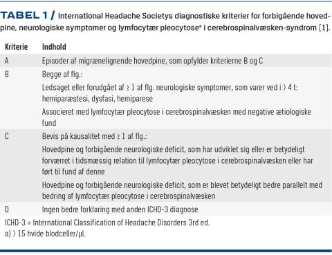 Forbigående hovedpine, neurologiske symptomer og lymfocytær pleocytose i cerebrospinalvæsken (HaNDL)-syndrom er en sjælden neurologisk tilstand, der er karakteriseret af anfald med migrænelignende hovedpine forudgået eller ledsaget af forbigående neurologiske udfald, som varer fra få minutter til timer [1, 2]. I cerebrospinalvæsken (CSV) ses lymfocytær pleocytose uden påviselig ætiologi [2]. HaNDL-syndrom ser voldsomt ud, men har en god prognose med komplet remission uden behandling [3].