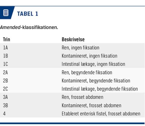 OA beskrives med amended-klassifikationen (Tabel 1) [14]. Klassifikationen er en international betegnelse for, hvor tilgængeligt abdomen er, hvor høj kontamineringsgraden er, og om der er en fistel. Frosset abdomen angiver en tilstand med fuldt fikseret bugindhold. Således er tilstanden med frossent abdomen og etableret fistel den alvorligste [14].
