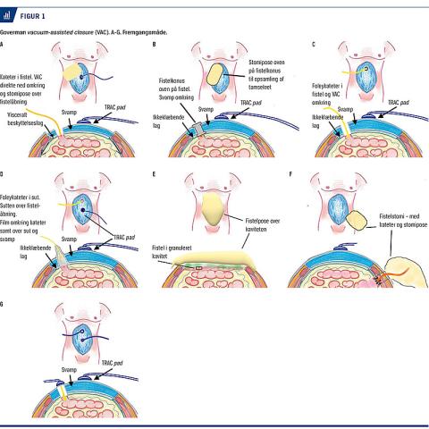 Goverman VAC – de seks trin: 1) ikkeklæbende lag, 2) sort svamp halveres i tykkelsen, og størrelsen tilpasses sårkaviteten, 3) film over og hul i svampen; filmen anbringes over fistlen, 4) kateter i fistel, 5) stomipose over fistel med kateter og 6) svagt vakuum [8]. Kan også anvendes over hudtransplantat (Figur 1A).