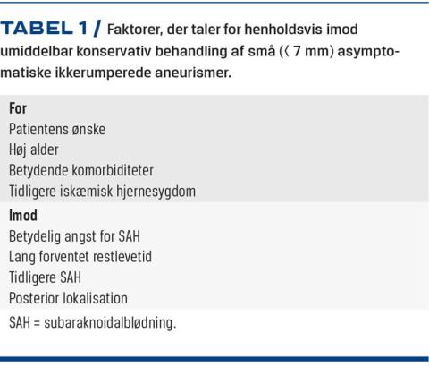 Ved at sammenholde en række patient- og aneurismespecifikke faktorer som etnicitet, hypertension, rygning, alder samt aneurismestørrelse, -form og -lokation med risikoen for behandlingskomplikationer [3-5, 7, 8] kan man ved en tværfaglig neurovaskulær vurdering skønne, at et kontrolforløb kan være mest fordelagtigt for patienten. Den vigtigste parameter for at vælge et kontrolforløb er aneurismets størrelse, da flere studier har vist, at små asymptomatiske IRA har lav rupturrisiko i modsætning til større IRA, som har væsentlig større risiko for vækst og ruptur [3, 5, 13-18]. Der findes ingen klar størrelsesmæssig grænse for, hvornår der skal vælges umiddelbar lukning frem for kontrolforløb. I de identificerede studier sås aneurismer < 7 mm at have en rupturrate på < 0,5% om året. En grænse mellem operation og kontrolforløb kunne således placeres ved 7 mm, omend andre faktorer som patientens alder og ønsker, komorbiditeter og aneurismets morfologi og lokalisation som ovenfor anført også medinddrages i overvejelserne (Tabel 1).