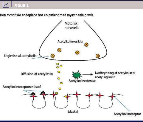 MG er en autoimmun sygdom med en prævalens på 7,7 pr. 100.000 indbyggere, og den årlige incidens er 0,4 pr. 100.000 indbyggere [2]. Årsagen er ukendt, men thymus synes at være involveret; ofte ses der hyperplasi af thymus, og 10% har tymom. MG er rettet mod acetylkolinreceptorerne i den motoriske endeplade. Denne er kontaktpunktet mellem den motoriske nervecelle og skeletmusklen. Et aktionspotentiale frigør acetylkolin, som diffunderer over den synaptiske kløft og bindes til acetylkolinreceptorerne, hvilket medfører en muskelkontraktion (Figur 1). Hos hovedparten af patienterne påvises der acetylkolinreceptorantistof, mens der hos få ses antistoffer mod muskelspecifik tyrosinkinase [1]. Antistofferne blokerer acetylkolinreceptorerne og medfører en destruktion af receptorerne. MG forårsager en neuromuskulær transmissionsdefekt, der klinisk viser sig ved kraftnedsættelse og hurtig udtrætning af skeletmuskulaturen. MG findes i en okular lokaliseret form, hvor omkring 50% af patienterne er positive for acetylkolinreceptorantistof, men oftest ses en generaliseret form med både okular og muskulær involvering, og af disse patienter vil op mod 80-85% være positive for acetylkolinreceptorantistof [1]. Symptomerne er dobbeltsyn, ptose, talebesvær, øget træthed, nedsat ansigtsmimik, tygge- og synkebesvær og en øget risiko for luftvejsinfektioner. Endvidere er der stigende med alderen og graden af eventuel komorbiditet en risiko for udvikling af respirationsinsufficiens. Desuden ses der affektion af truncusmuskulaturen og nedsat vitalkapacitet. Prognosen bedres ved behandling med immunosuppressiva og immunmodulerende terapi. Fatal udgang er sjælden og skyldes oftest respirationsinsufficiens. Førstevalgsbehandling af MG er acetylkolinesterasehæmmeren pyridostigmin. Tymektomi foretages hos alle patienter med tymom. En række farmaka kan forværre sygdommen og bør derfor undgås (Tabel 1).