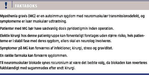 Myasthenia gravis (MG) er en sjælden sygdom, som de fleste læger derfor ikke møder i hverdagen, selvom prævalensen og incidensen er stigende. Stigningen skyldes muligvis forbedret diagnostik og øget opmærksomhed på sygdommen [1]. Generelt er brug af muskelrelaksantia en udfordring hos patienter med MG. Et ny antidot til revertering af den neuromuskulære blokade kan bevirke ændrede procedurer ved anæstesien. I denne statusartikel gennemgås litteraturen med henblik på optimeret håndtering af det