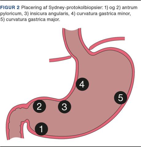 HPP ses sjældent på en normal ventrikelslimhinde, men typisk ved langvarig H. pylori, KAG eller perciniøs anæmi [3]. Sjældnere ses HPP i relation til ulcerationer, erosioner, kirurgi eller i en slimhinde med let atrofi eller metaplasi. Bl.a. herfor anbefales det, at man ved mindste visuelle mistanke foretager systematiske biopsier, jf. Sydney-protokollen. Sådanne biopsier bidrager til diagnose, opfølgning og risikostratificering. Ved Sydney-protokollen tages to biopsier fra antrum pyloricum og en biopsi fra øvrige lokalisationer (Figur 2) [13, 14]. HPP har en prævalens på 1,8% og udgør omtrent 14% af alle ventrikelpolypper, prævalensen er relateret til førnævnte slimhindeforandringer [15]. Størrelsen kan variere, den er dog hyppigst < 0,5 cm [16]. Den typiske lokalisation er antrum, hvor de ses som små halvkugleformede polypper med en glat overflade, der er rødlig i forhold til den underliggende slimhinde, hvidligt ekssudat og fibrin kan være synligt (Figur 1). Polypperne kan også være flade eller sessile, eventuelt med lobulærstruktur og ulcerationer. Der ses et tæt mønster af irregulære kapillærer, sidstnævnte er et vigtigt kendetegn ved narrow-band imaging [17]. Oftest er HPP solitære, ved multiple HPP > 20 stk. og særligt hos personer under 40 år bør man overveje de arvelige polyposetilstande som FAP. Det er ikke muligt visuelt at udelukke dysplasi, og diagnosen bør stilles histologisk. Størrelse > 1 cm, pedunkuleret udseende, symptomer samt betydende mistanke om dysplasi indicerer resektion. HPP har betydeligt malignitetspotentiale: Jo større polyp, des større risiko. Dysplasi ses i 2-19% og malignitet i 1-2% af tilfældene [18]. Ved dysplasi er der 6% risiko for synkrone neoplastiske fund i den omkringliggende slimhinde [11].